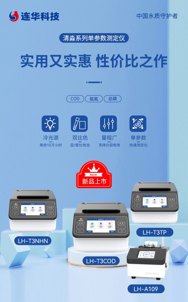 采用冷光源、窄帶干涉技術的清淼系列LH-T3單參數水質測定儀,光源壽命長達10萬小時,保證了測量的穩定性和準確性。同時,全新的9孔智能消解儀,經濟實用,大大提高了檢測效率。