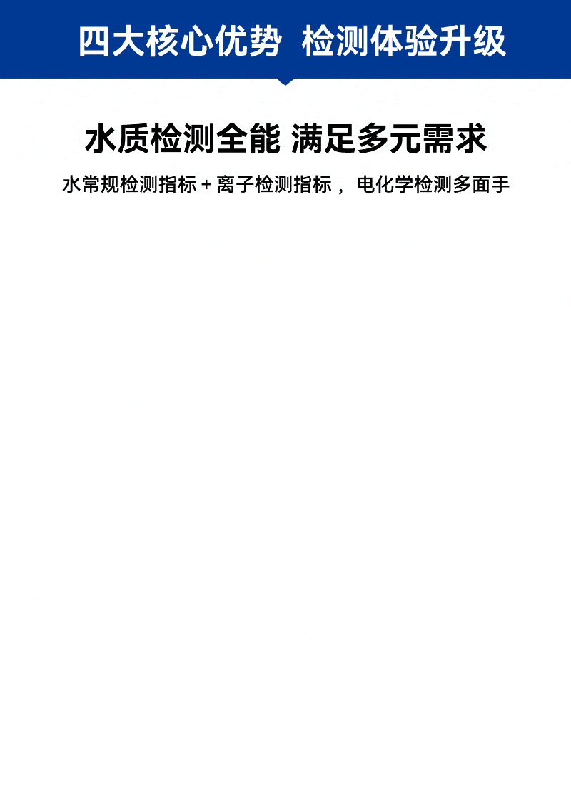 1、手持式迷你主機,支持pH、溶解氧、電導率、鹽度、ORP、TDS、SAL、溫度8項指標及氟、氯、溴、碘、鈣、鉀、鈉、硝酸根、銨根等離子快速 檢測,滿足各領域水質檢測需求;