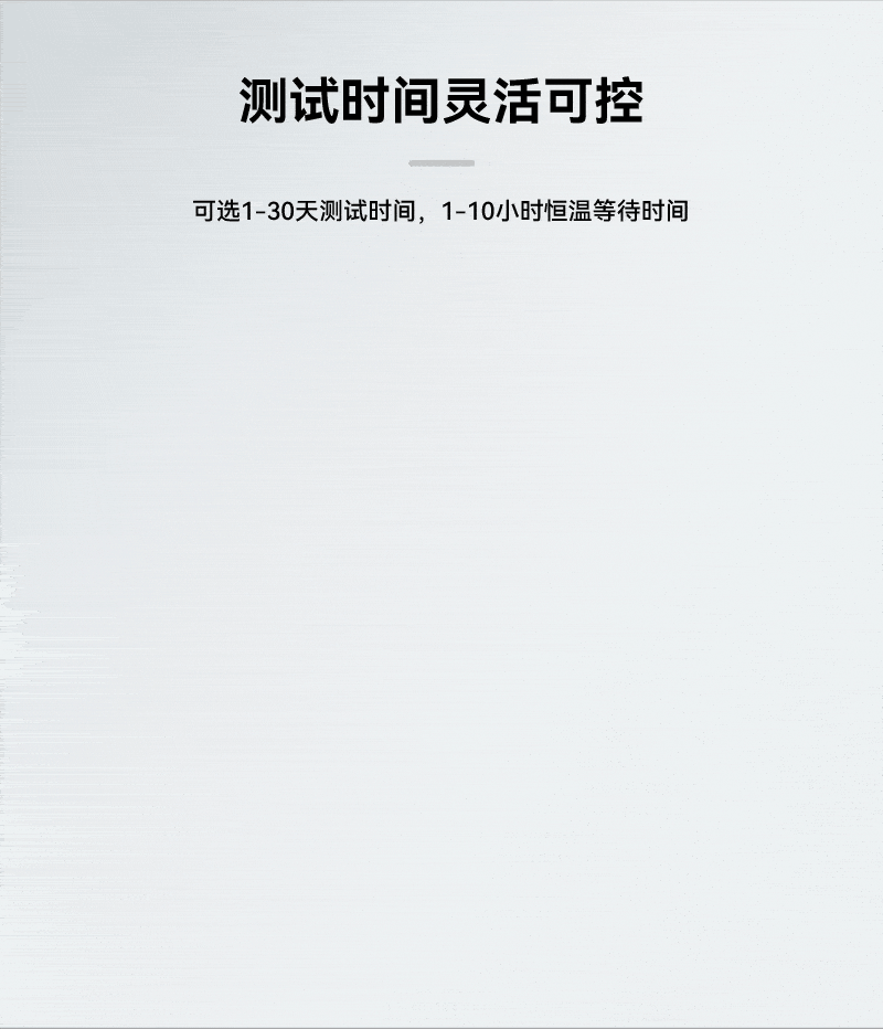 1、每個(gè)測(cè)試帽可選1-30天測(cè)試時(shí)間,1-10小時(shí)恒溫等待時(shí)間,可單獨(dú)設(shè)置樣品參數(shù),每個(gè)測(cè)試帽可記錄100條歷史記錄,自動(dòng)覆蓋舊數(shù)據(jù);