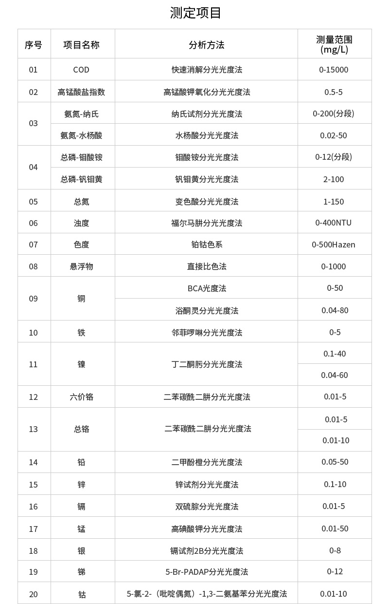 COD高量程:預制試劑:(20~15000)mg/L(分段);普通試劑:(20~10000)mg/L(分段)
